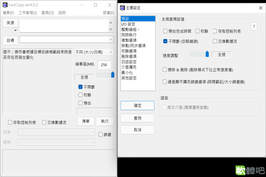 FastCopy 是 Windows 平台上最快的檔案拷貝、刪除軟體、複制500MB檔案只須40秒。 由於其功能強勁,性能優越,一時間便超越相同類型的所有其他軟體。由於該軟體十分小巧,你甚至可以直接將主程式資料夾中的檔案複製到任何可移動儲存裝置中,方便攜帶,隨取隨用,更是完全免費。 FastCopy 主要包含下列功能: 1.完全支援拖曳動作,支援拖曳多個檔案到來源中; 2.支援外掛整合,方便的讓你利用右鍵選單直接複製檔案; 3.支援三種不同的 HDD 模式; 4.內建多種人性化的動作模式; 5.支援過濾,可以使用萬用字元; 6.支援工作管理; 7.支援指令行動作, 教學請看看下面說明; 第一種,如 Nullsoftcopy 一樣先選擇來源目錄,然後選擇目標目錄,點[執行]按鈕後即可開始拷貝。 第二種,註冊右鍵選單。點選單「設定--->右鍵延伸」彈出「右鍵延伸」對話方塊,然後點 [安裝] 按鈕即可註冊右鍵選單。你可以直接在任意檔案或資料夾上面點右鍵彈出選單,然後選「複製(Fastcopy)」、「刪除(Fastcopy)」、「移動(Fastcopy)」等命令,即可開始複製、刪除或移動檔案或資料夾。 第三種,註冊右鍵選單。通過右鍵拖曳到目標目錄,彈出快顯功能表命令,然後選「複製(Fastcopy)」、「刪除(Fastcopy)」、「移動(Fastcopy)」等命令,即可開始複製、刪除或移動檔案或資料夾。